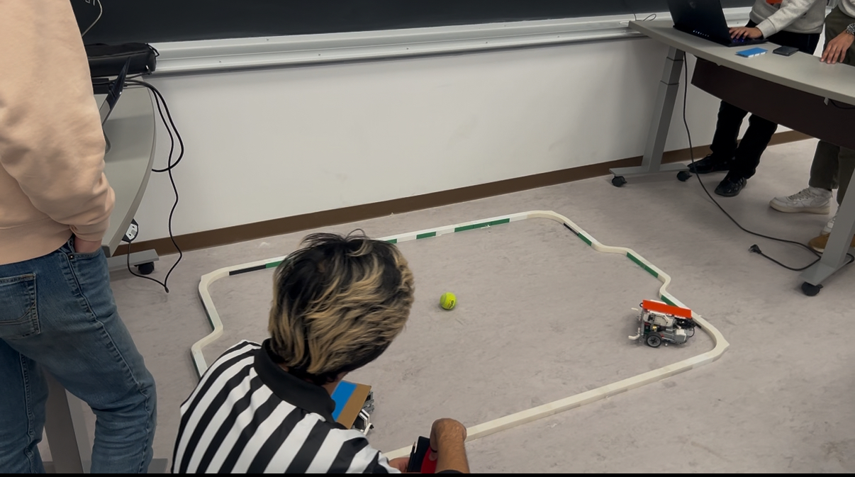 Our team built a fully autonomous RoboSoccer robot to compete in a RoboSoccer tournament. We designed and constructed the robot and implemented its behavior following object-oriented programming principles and clear abstractions, enabling modular and maintainable development. The robot interprets the field, tracks the ball and other robots in real time, and responds using a state transition table to perform strategic actions like moving, striking, or recovering when stuck. Through our efforts, the system successfully advanced to the playoffs, demonstrating reliable self-directed gameplay under competitive conditions.